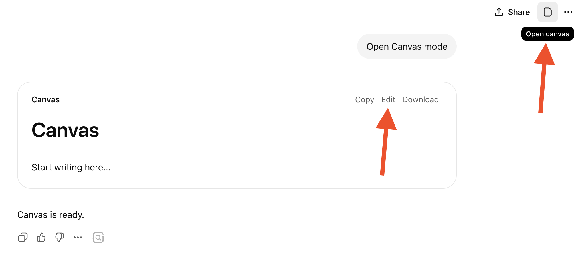 Simply write a prompt. ChatGPT should turn on the Canvas mode for you. Select either Edit or Open canvas.