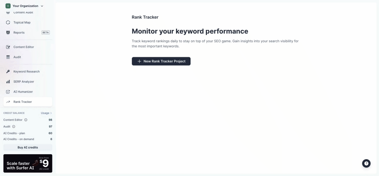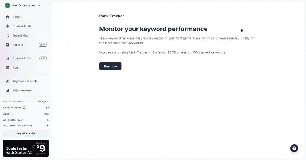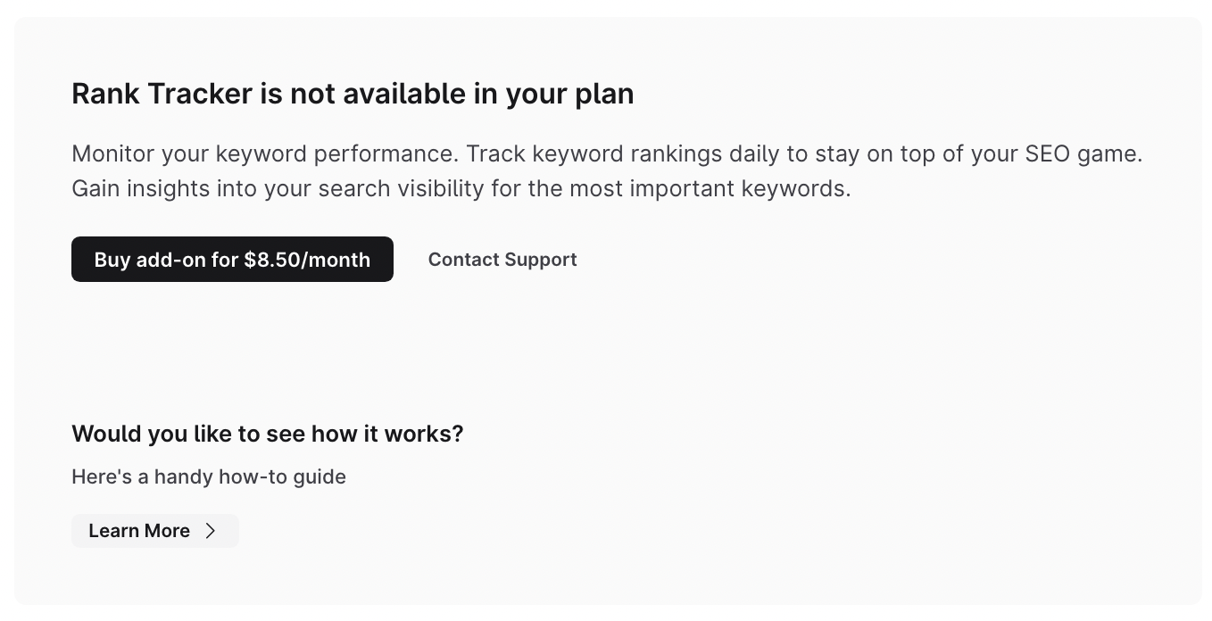 First, navigate to Tools > Rank Tracker directly from your sidebar. If you did not purchase the Rank Tracker in the past, this is what you'll see: