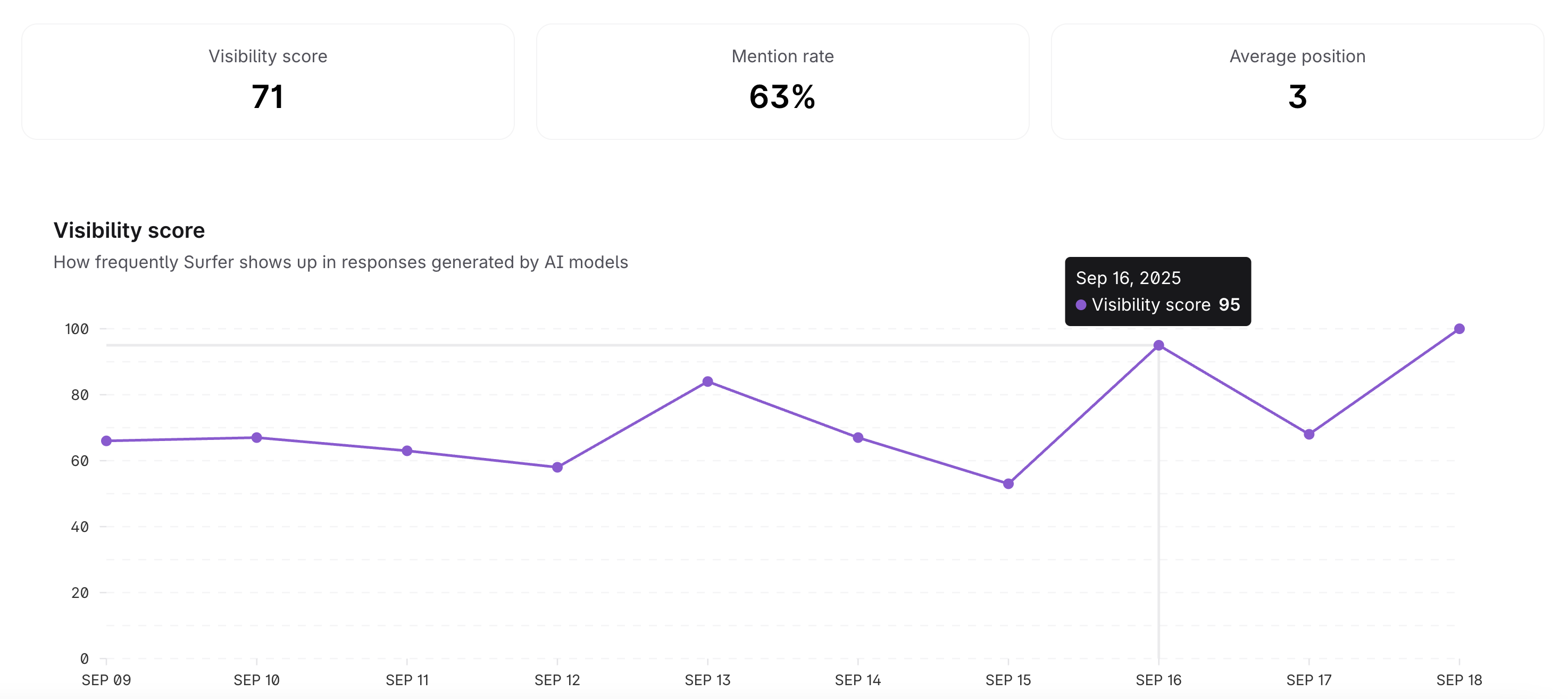 Shows how often and how prominently your brand appears in AI answers. A higher score means your brand is consistently showing up in noticeable spots.