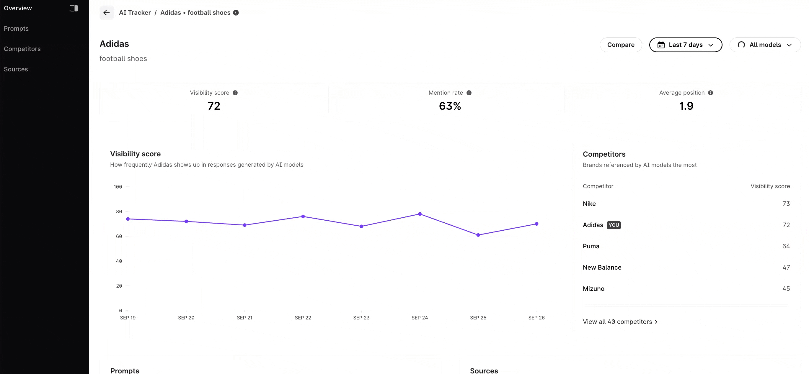 You can go beyond tracking your own brand and see how you are performing against competitors using the same prompts.