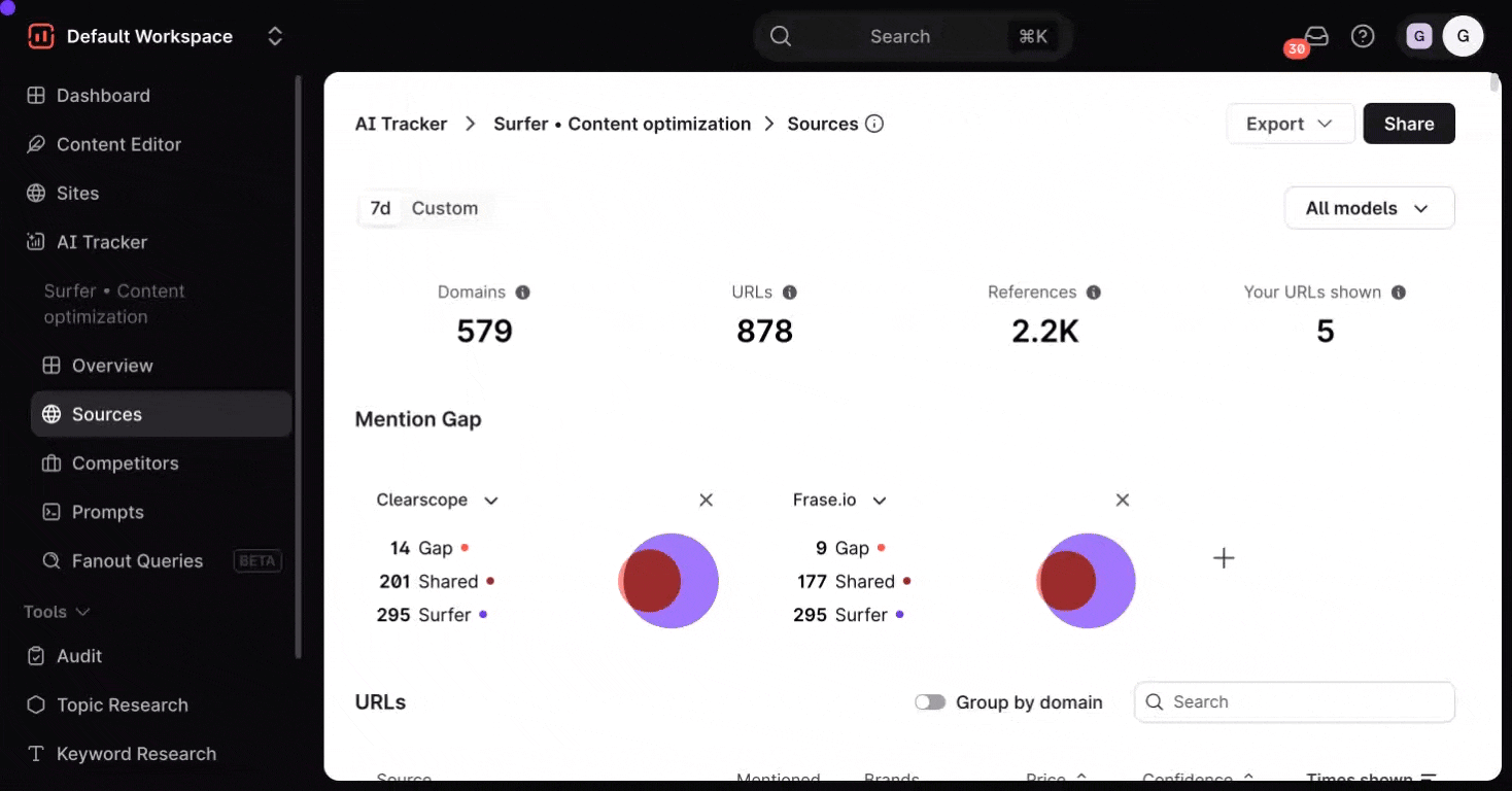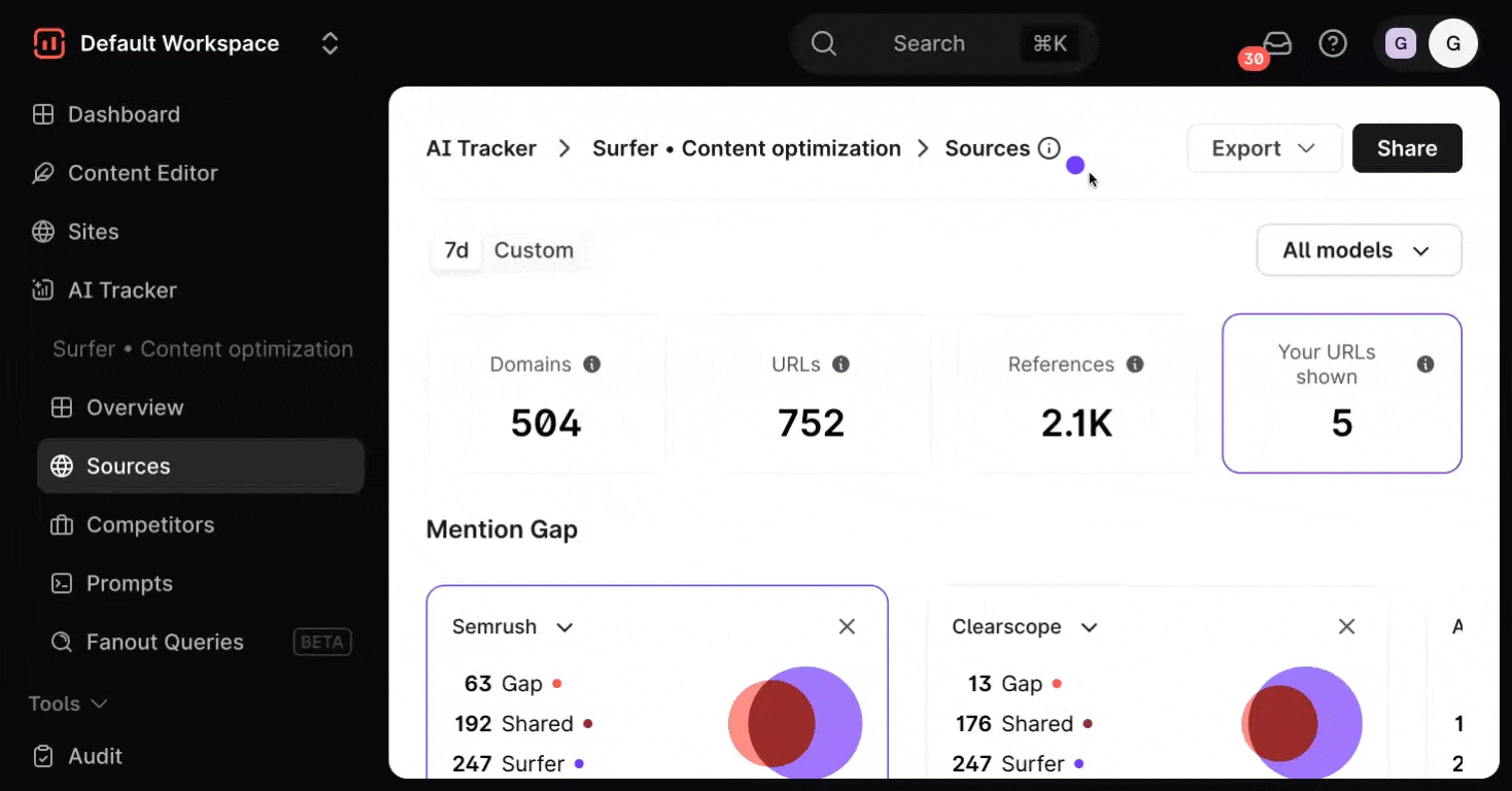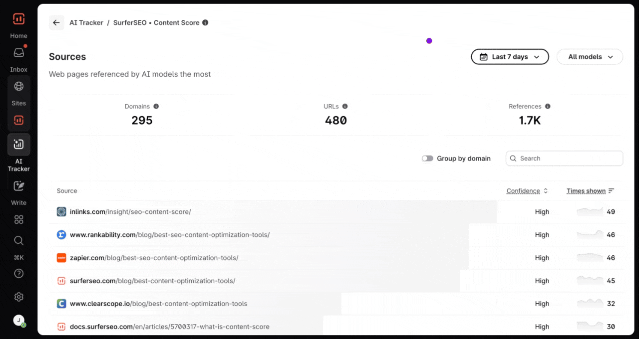 AI Tracker's Sources Dashboard gives you a behind-the-scenes look at where your AI content is pulling information from. It helps you monitor how often specific domains and URLs are being cited by large language models (LLMs), giving you greater transparency and control over your AI-generated content.