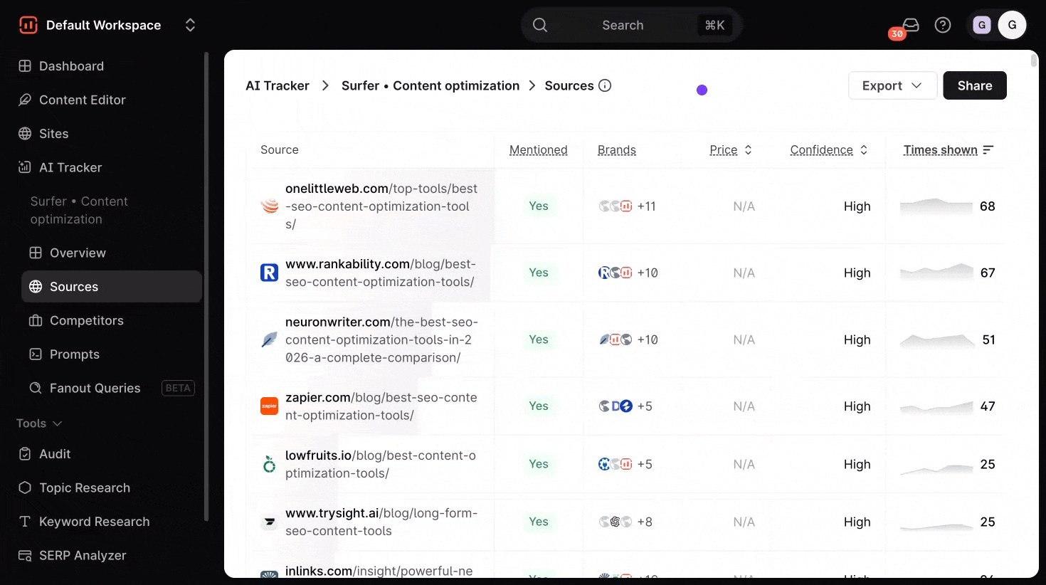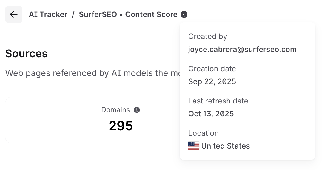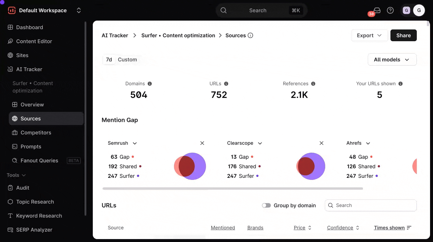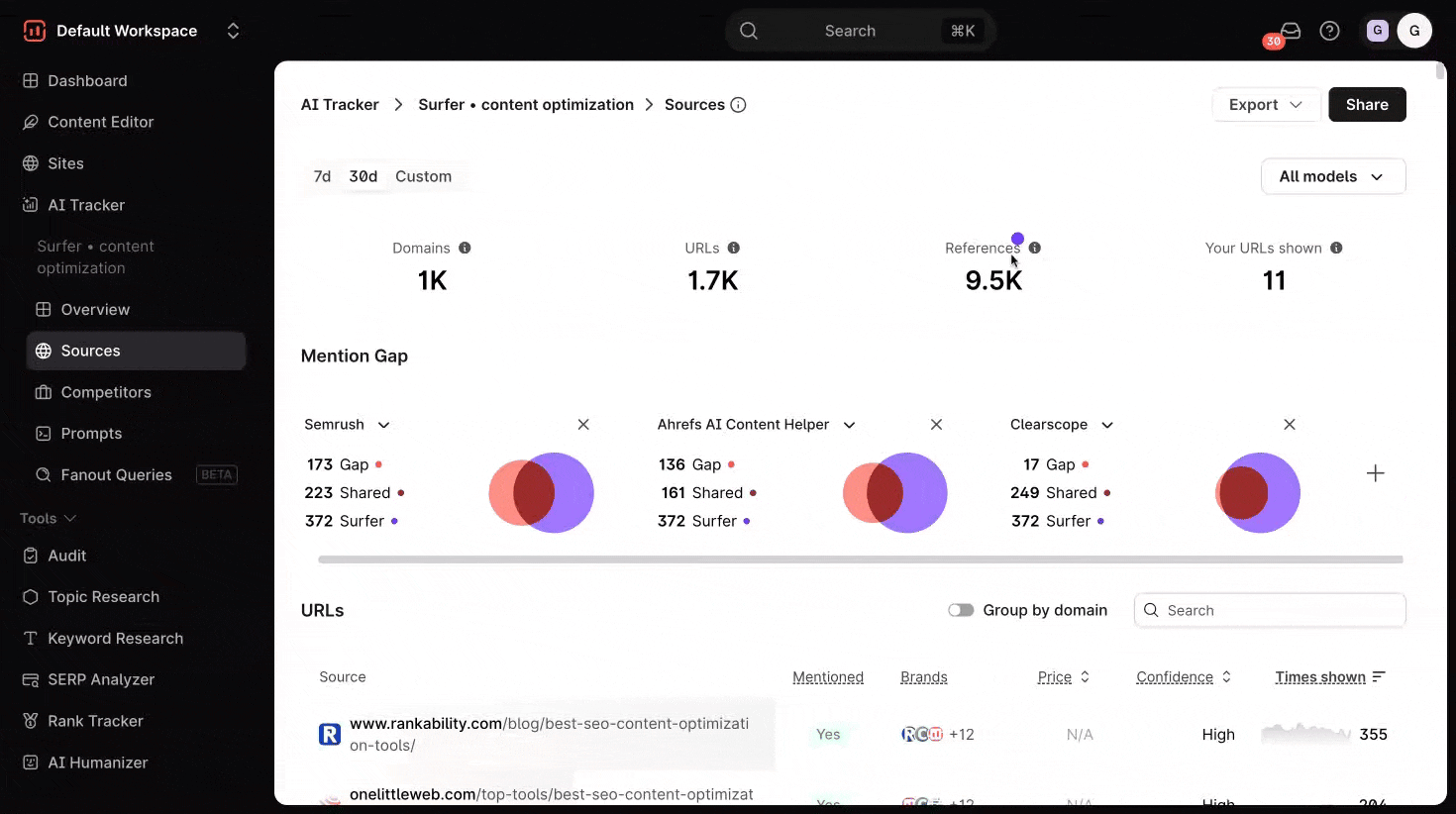 AI Tracker's Sources Dashboard gives you a behind-the-scenes look at where your AI content is pulling information from. It helps you monitor how often specific domains and URLs are being cited by large language models (LLMs), giving you greater transparency and control over your AI-generated content.