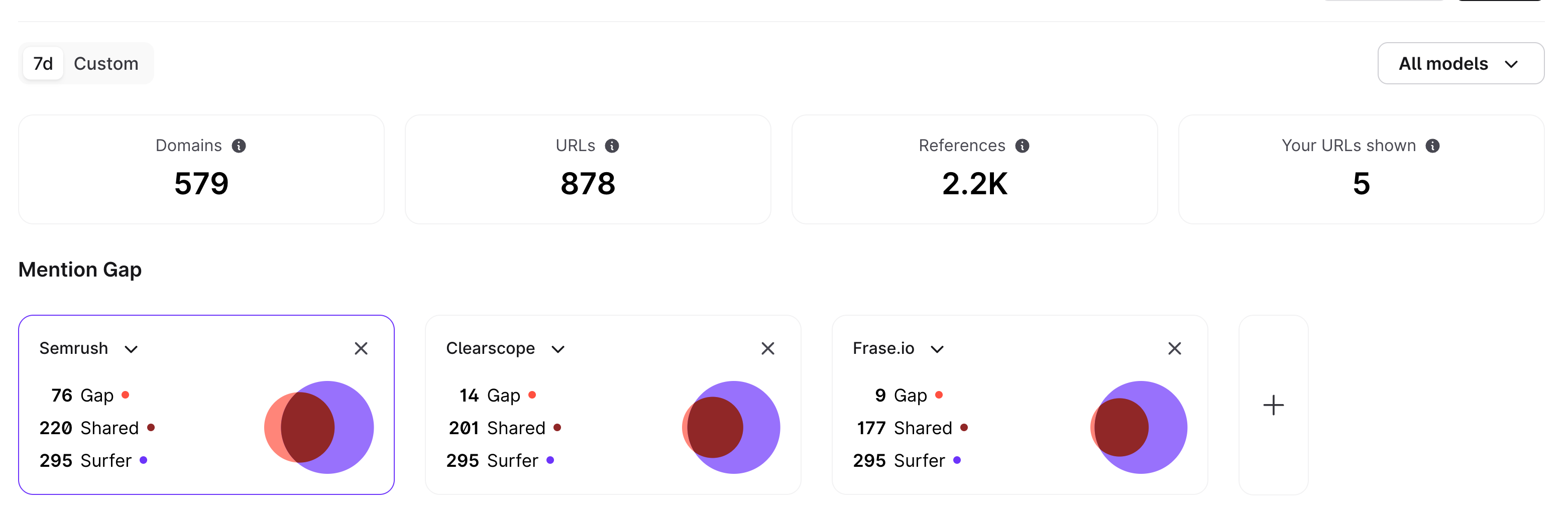Mention Gap: shows the difference and overlap in how often your brand is mentioned compared to a competitor across AI models