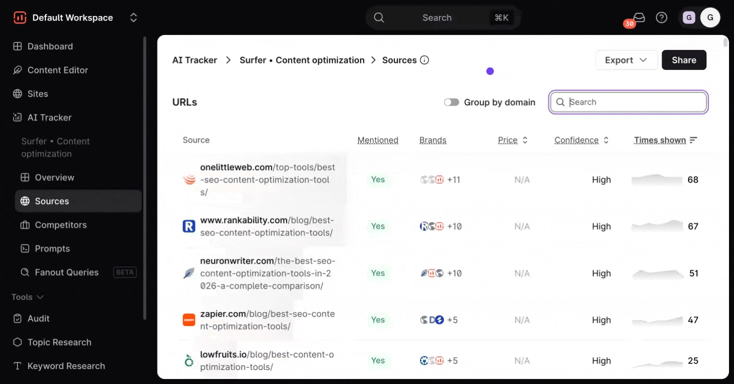 This helps you quickly assess whether a specific site (like surferseo.com) is a major source, and exactly which of its pages the AI is referencing. You can switch back to the default view any time by toggling the button off.