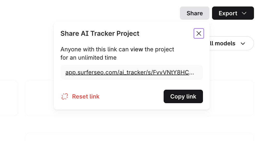 Additionally, you can share a view-only access to your AI Tracker report. Perfect for sharing wins with your team or clients to keep them updated on your visibility progress.