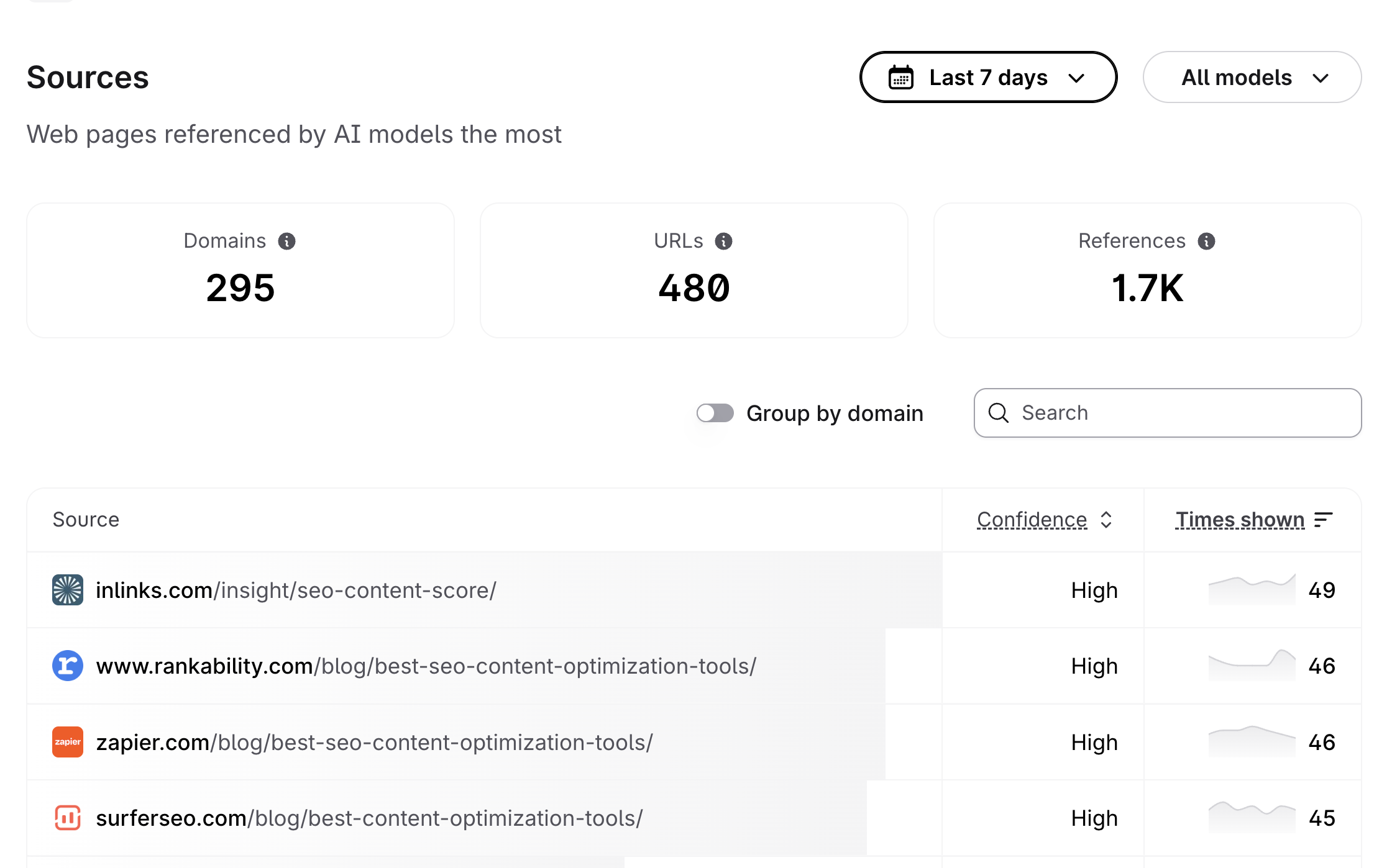 However, if you're looking for a more organized view, you can simply toggle the 'Group by domain' button to group all URLs under their respective root domains. When this view is enabled, you’ll notice: