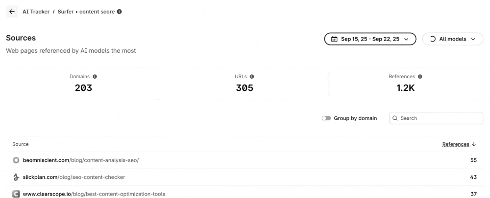 This helps you quickly assess whether a specific site (like surferseo.com) is a major source, and exactly which of its pages the AI is referencing. You can switch back to the default view any time by toggling the button off. 🔂