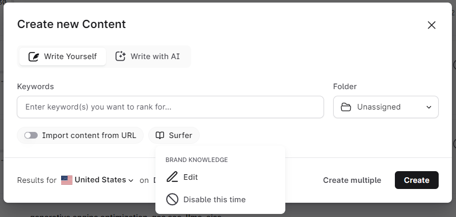 Once you define your Brand Knowledge, it is enabled by default when creating a new AI article or a Content Editor query. You can keep it on or use the "Disable this time option".