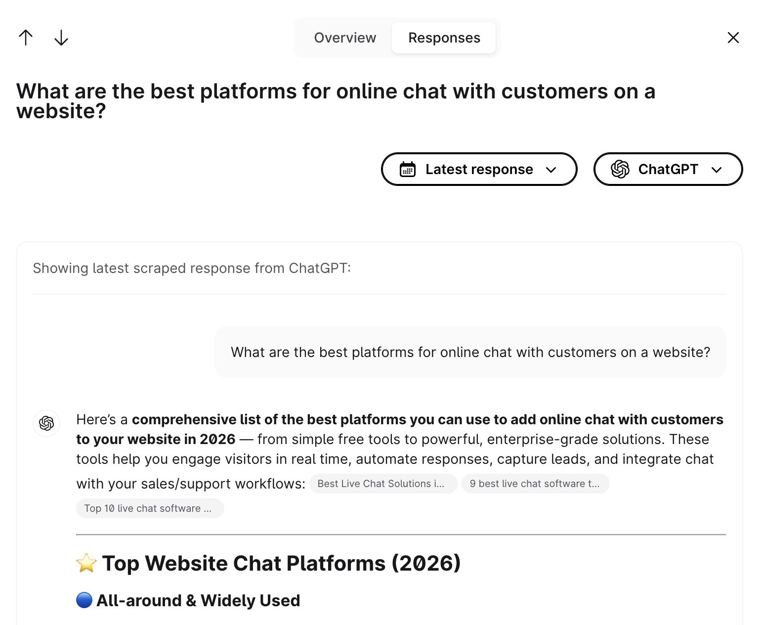 In the Responses section, you can see the exact answers generated by AI for a chosen prompt, including the most recent response by default.