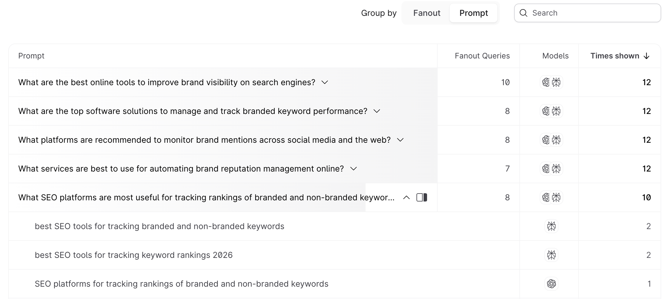 - Each row in the table represents one prompt. You can click the arrow next to a prompt to expand it and see the individual fanout queries underneath.