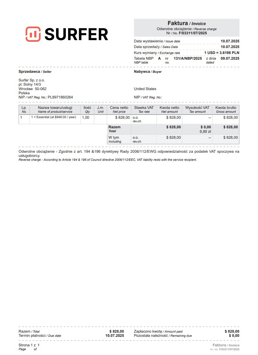 Surfer is a Polish company and is also tax registered in the United Kingdom. Whether you’re charged VAT depends on your location and VAT ID status: