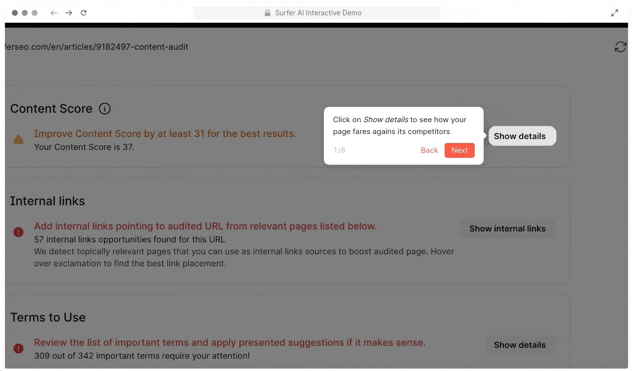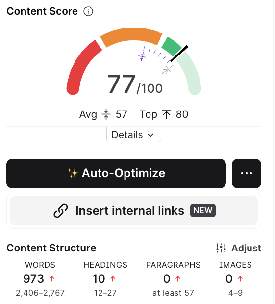Unlike traditional SEO metrics that overemphasize structure, our algorithm puts more weight on naturally using relevant and prominent terms to help with improve your rankings. This ensures your Content Score reflects real quality signals used by pages already winning in search results.