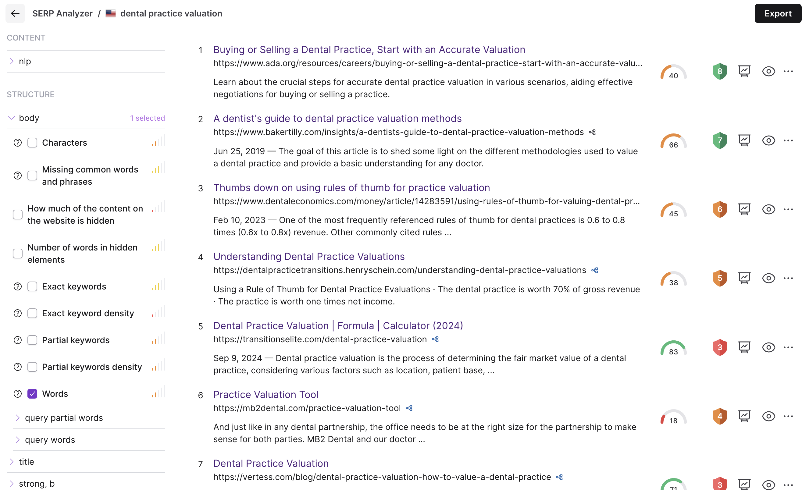 With that said, SERP Analyzer is the only tool that lets you see your competition's Content Score past the top 20 position in the SERPs. Because of this, the Content Score calculation may also differ.
