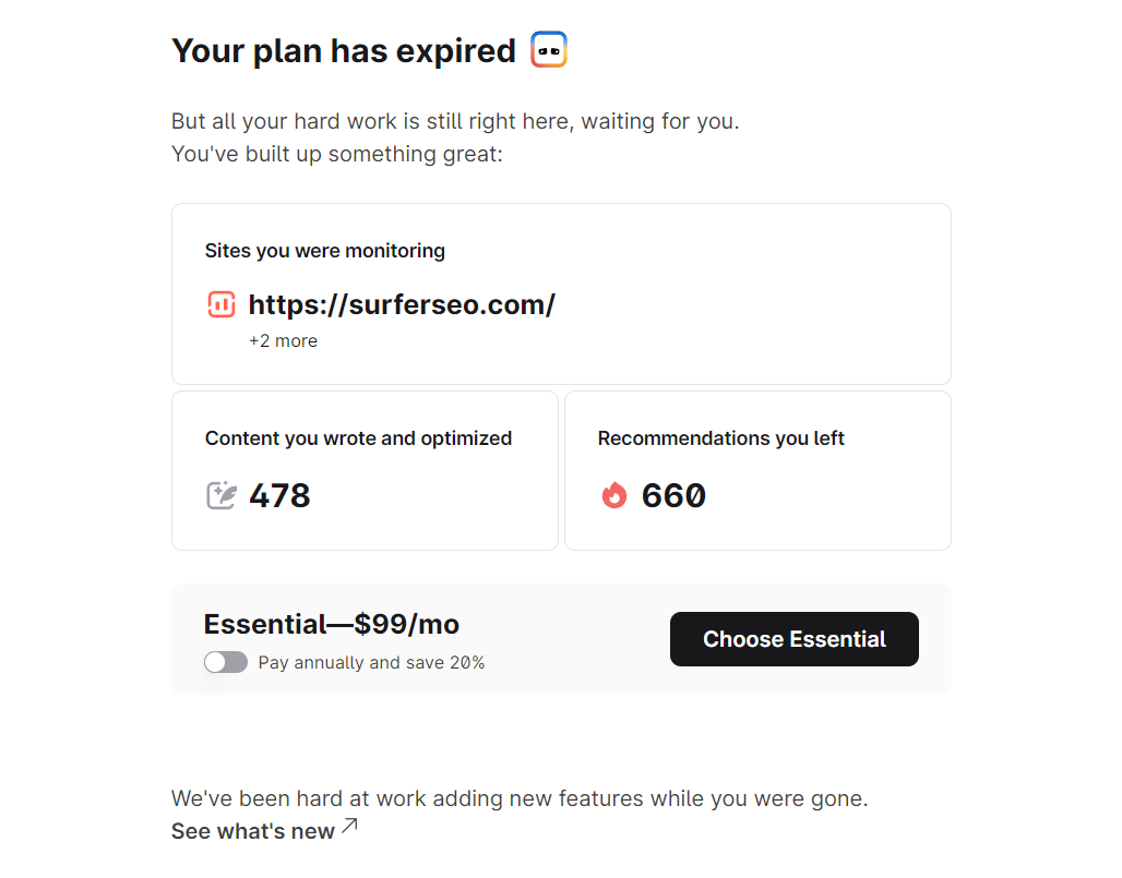 When your plan expires, you’ll no longer have access to Surfer’s core tools — but don’t worry, your data remains safe and sound.