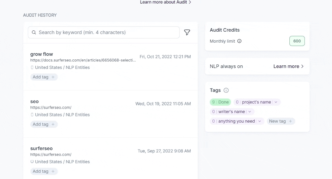 💡 To help you keep consistency across the whole toolset, your tags set is the same for Domain Planner, Audit, SERP Analyzer, Content Editor, and Keyword Research.