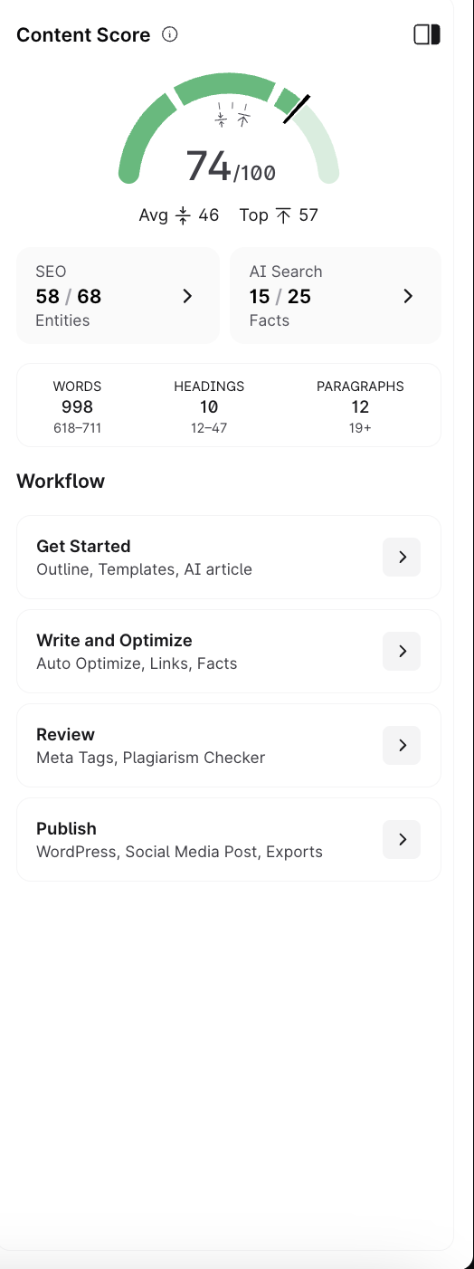 Write and Optimize: You can keep on working on your draft by reviewing our suggested terms under SEO Entities and optimize for AI Search by adding Facts. You can also insert automated Internal Links on this step.