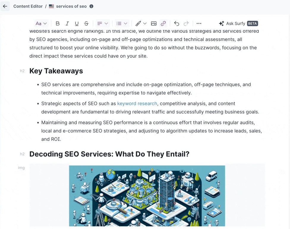 Surfer AI takes the guidelines provided and automates the article creation process. It generates content based on the suggestions and parameters set by the user. If you want Surfer to write for you, check out these articles.