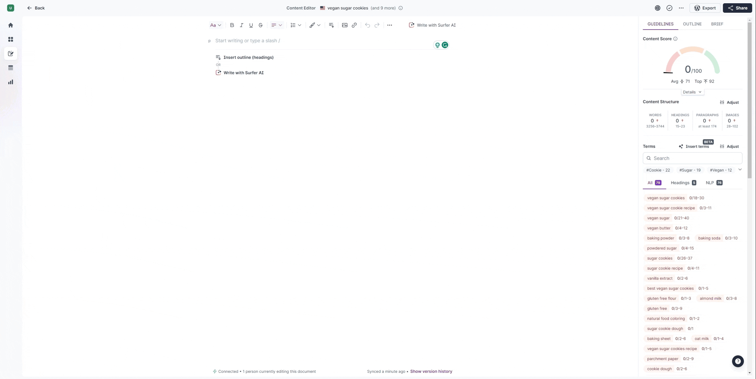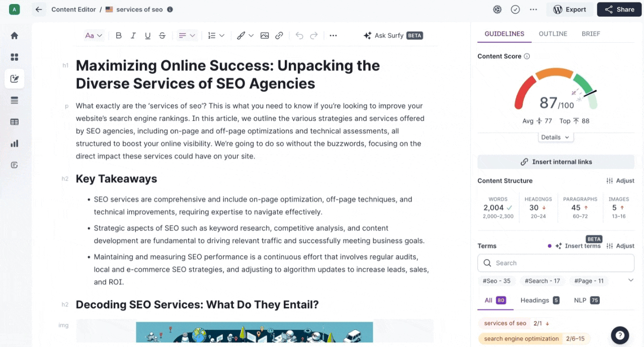 With the help of Surfer’s algorithms and top-ranking pages (competitor analysis), you will be given guidelines on structuring your article by sharing a detailed list of relevant keywords to include in your content to rank well. Not only that, but you will also receive real-time feedback on overall on-page optimization with the help of Surfer’s Content Score.