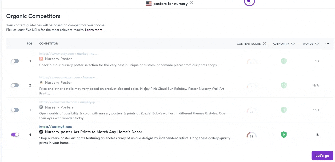 π‘The step of reviewing your guidelines before writing is super important and should not be skipped! Make sure to benchmark only against those competitors with high Content Scores and serving the same search intent as you.