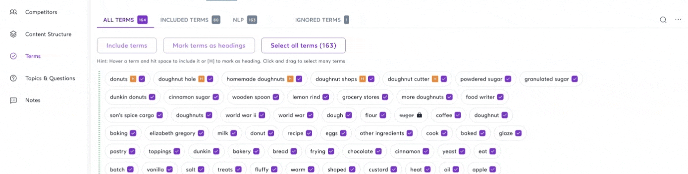 You can switch between All terms, Included terms, NLP, and Ignored terms to filter out words from each category.