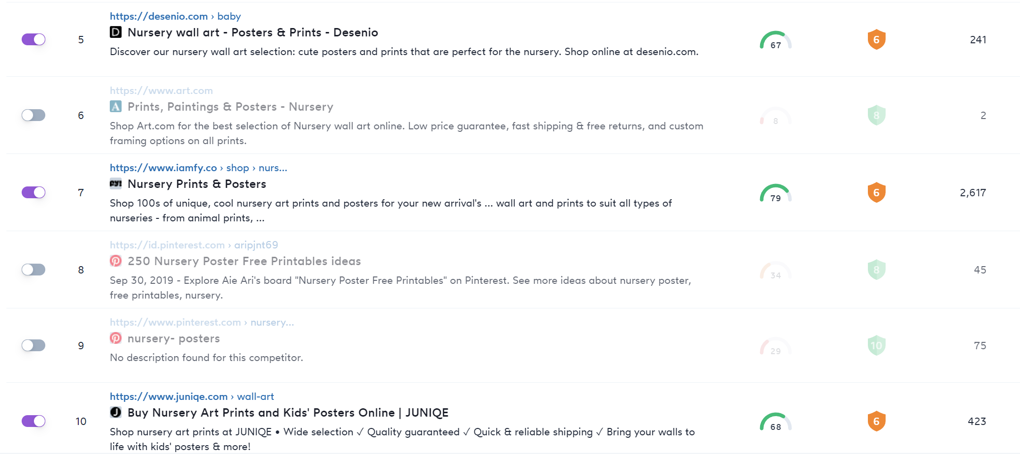 This section shows the top ten pages ranking currently for your keyword in Google search for your location. You can also choose the "Load more competitors" button to reveal another ten competitors.