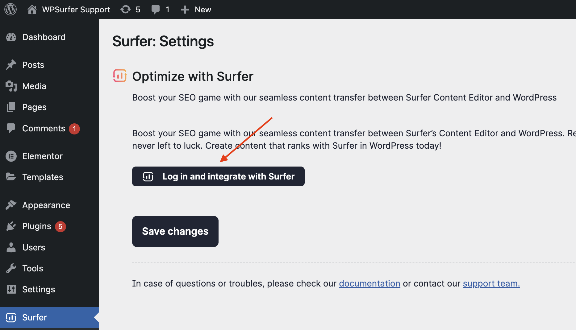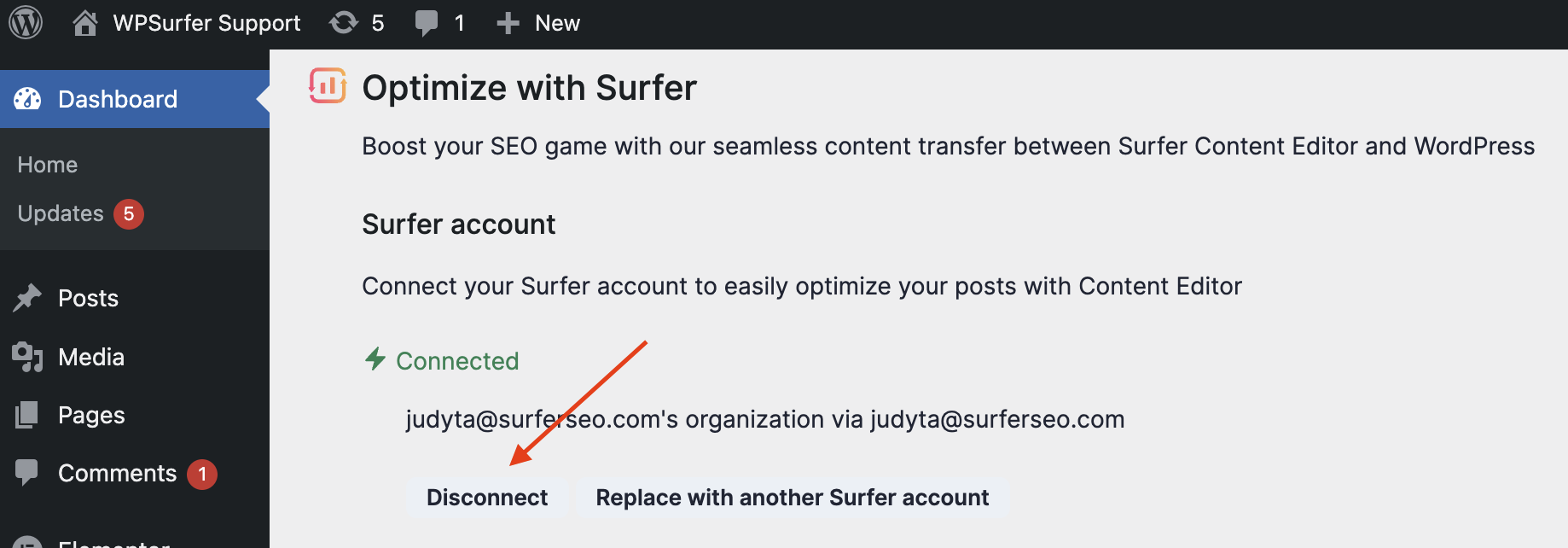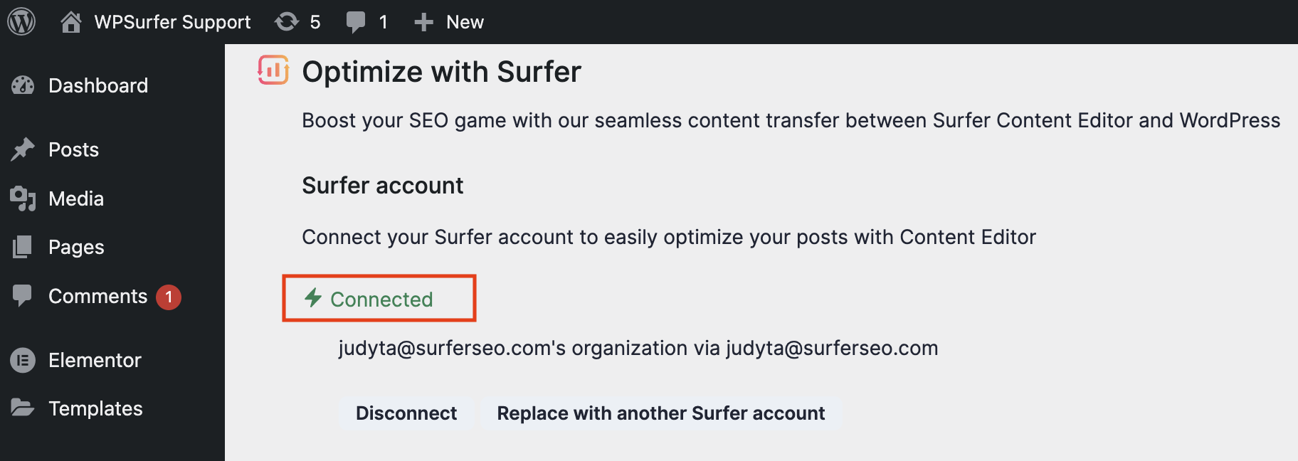 Your page can only be connected to one Surfer account at a time, but your Surfer account can be connected to multiple WordPress pages.