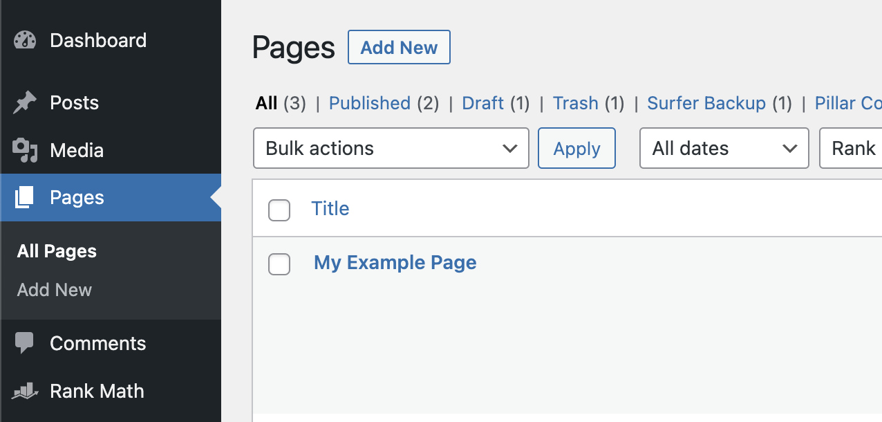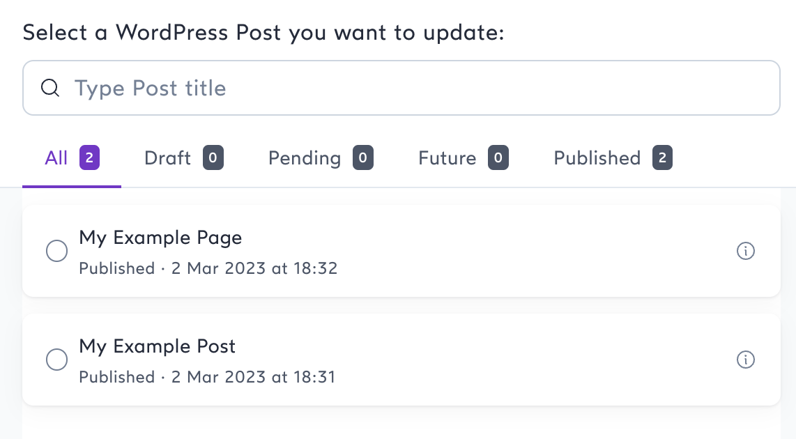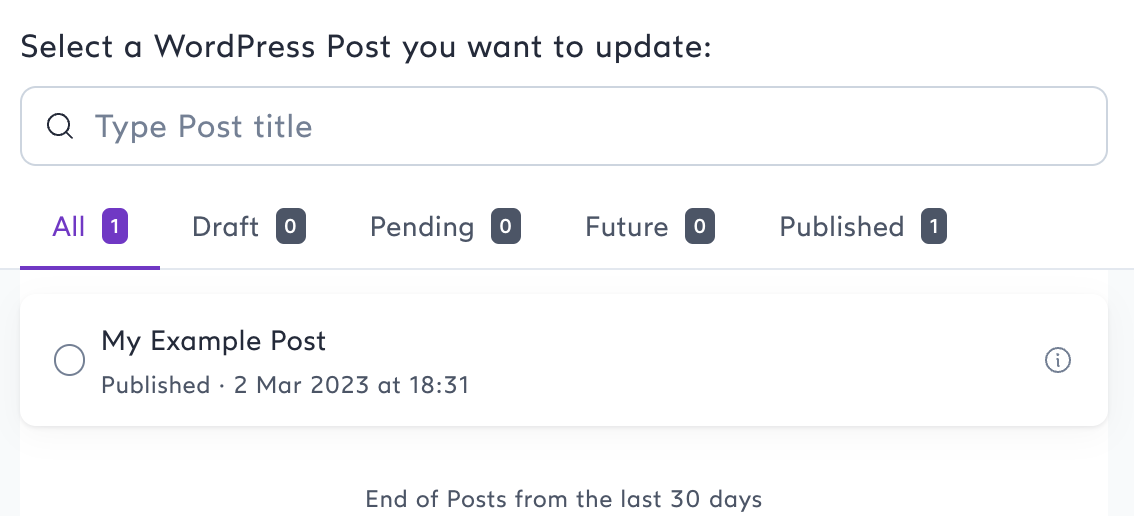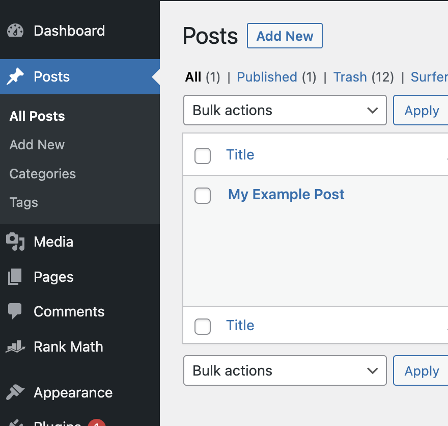 The filter method allows you to modify the list of posts possible to update from Surfer by changing post types used for a search query.