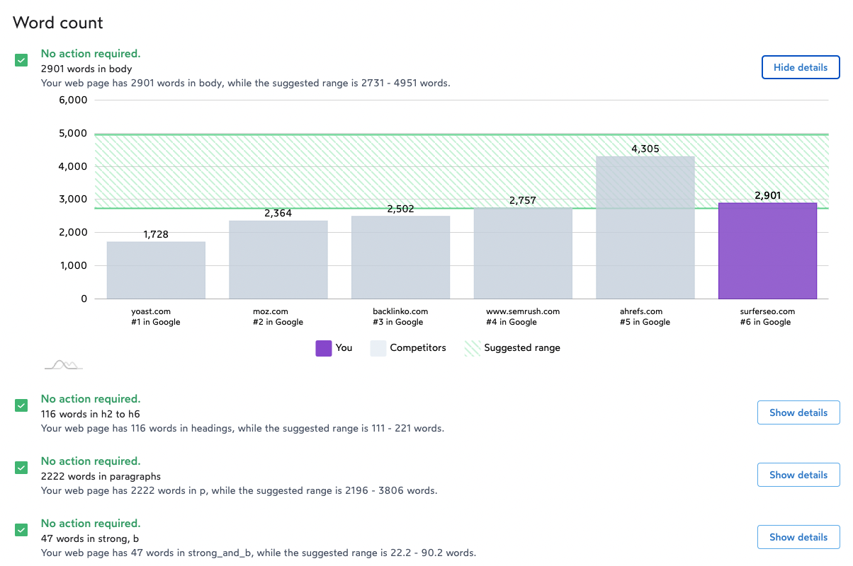 Surfer will show you how many times your competitors used this keyword on their pages and make suggestions according to good practices, like putting at least one exact keyword in your title or h1.