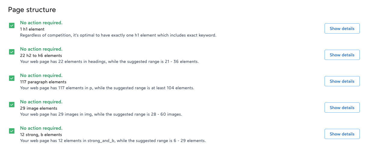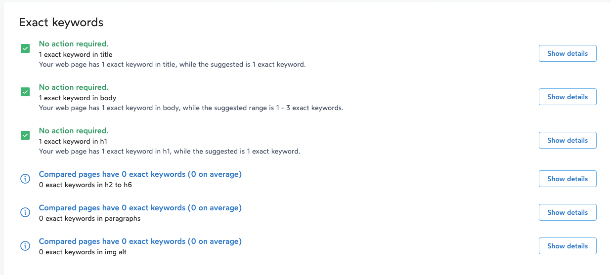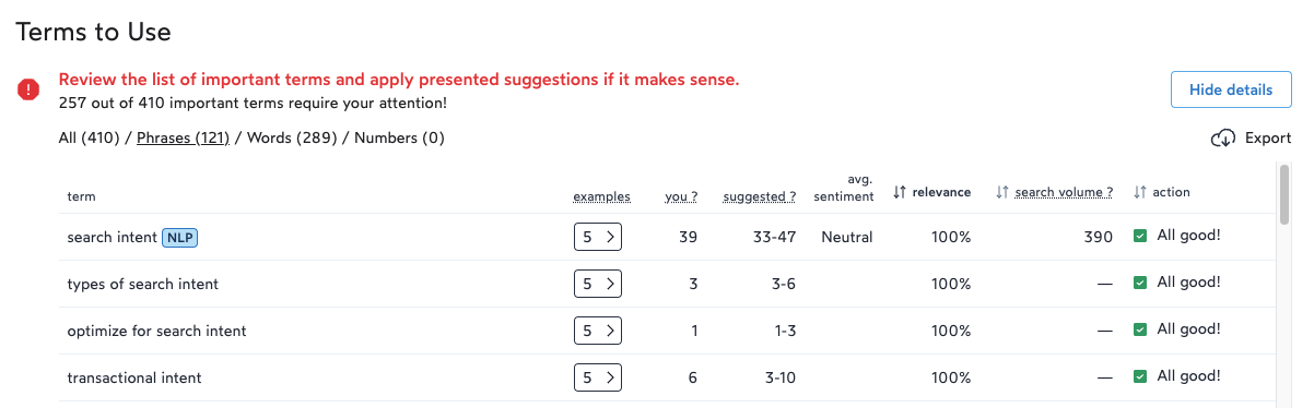 All of the above are based on our AI-powered algorithms. For the number of occurrences suggested, we take the average density on competitors' pages and recalculate it to apply it to your current word count.