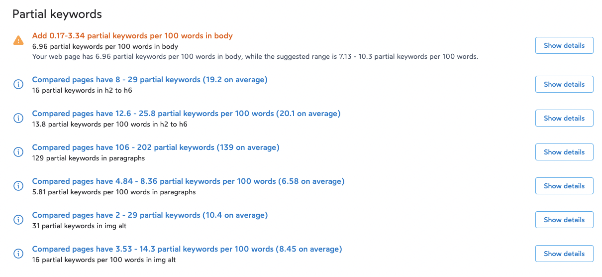 This section will guide you on how you can cover the content gap with partial keywords and will point out where you can add them. Sure, it’s probably not at the top of the list of priorities. We suggest that you focus on keyword density first, but every little tool we have to optimize content helps.
