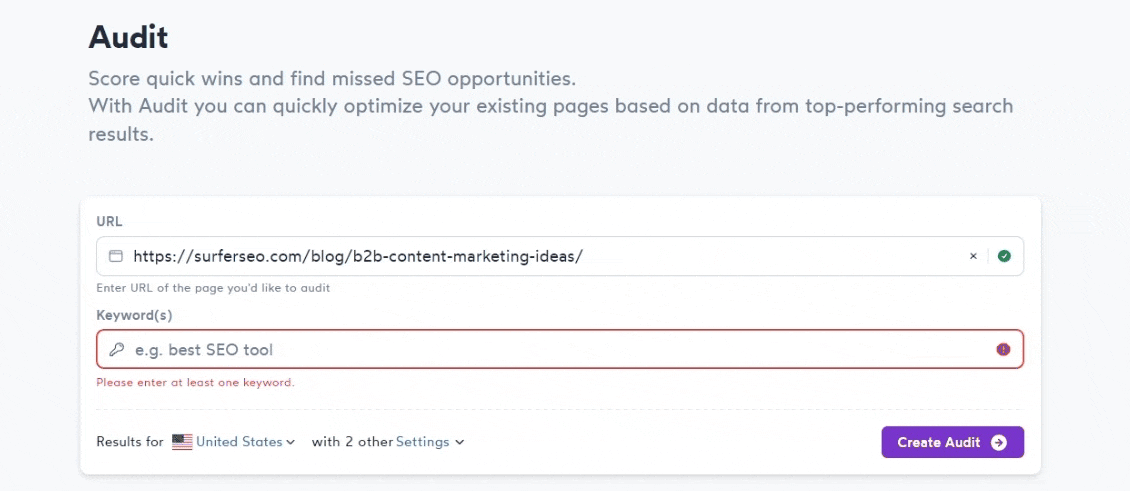 As the name suggests, our Audit is useful for reviewing existing content. It allows you to compare your article's SEO practices to your direct competitors.