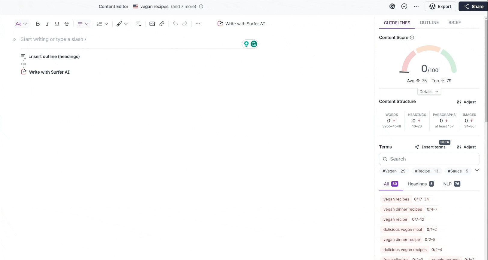 Surfer’s Content Score is based on over 100 different factors, which are simply communicated by your automatically generated guidelines. You’ll be told how to structure your work with regard to headings, paragraphs, image count, and key terms to use powered by NLP analysis.