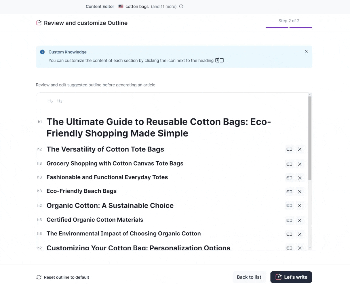 In the "Review Outline" section, you can take customization even further. Add your personal insights and sources to each H2 and H3 heading. It's easy! Simply click on the icon located on the right of each heading.