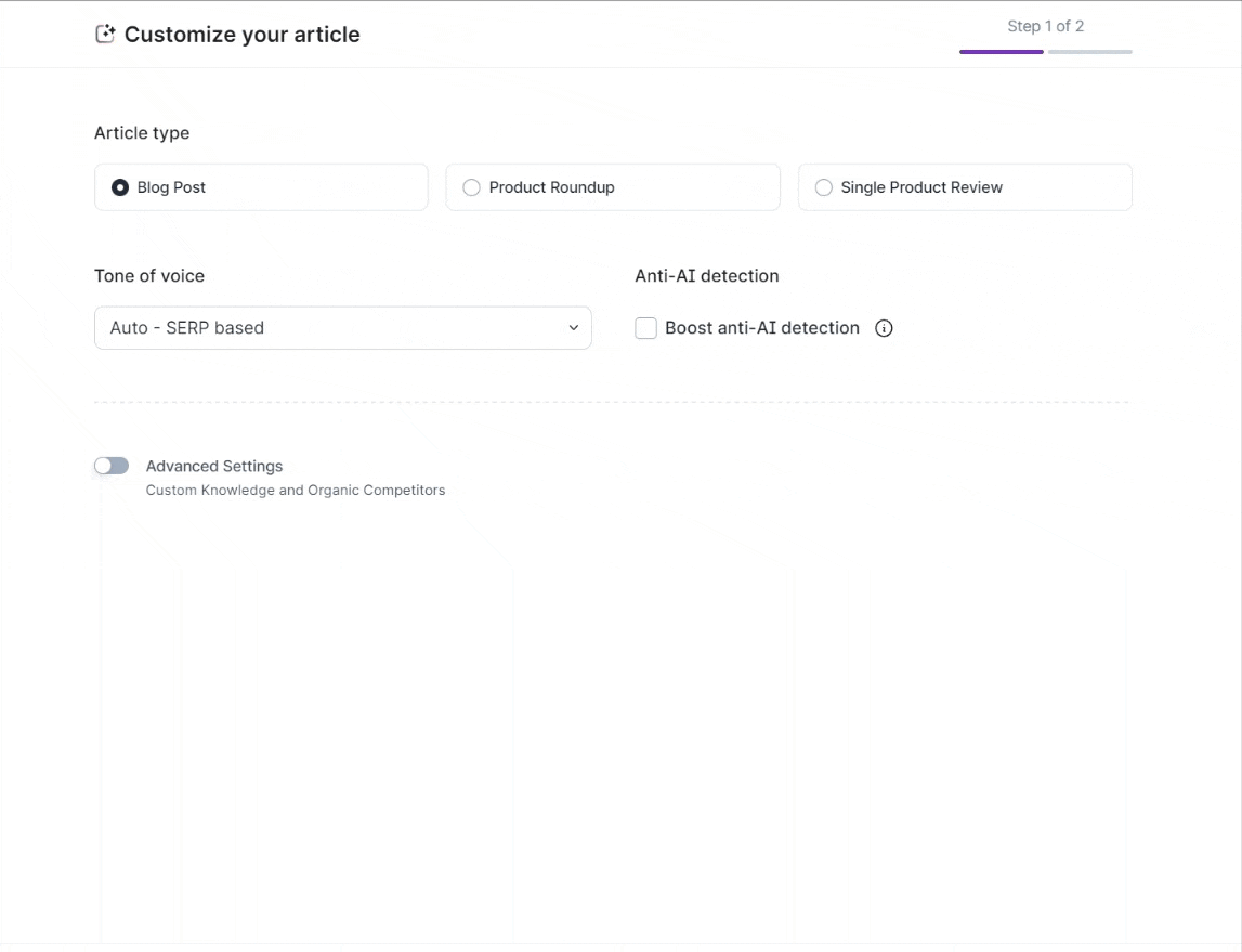 Custom Knowledge helps you to customize your AI articles by enriching them with your expertise on a topic which allows you to create unique and even more engaging content. Ranking higher and improving your E-E-A-T are now made easier!