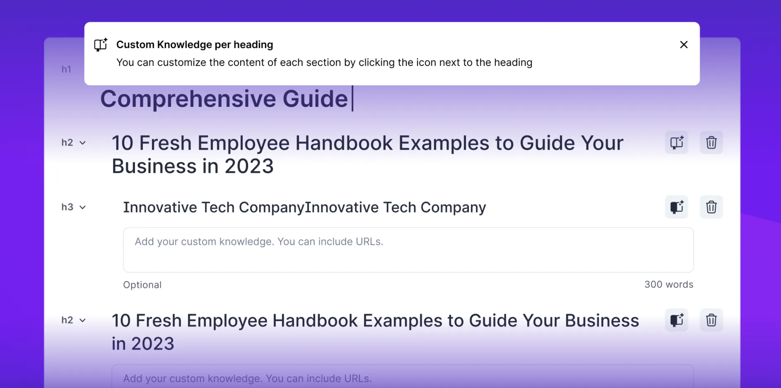 You can add Custom Knowledge that would be mentioned throughout a whole article or in a specific section. Both options can be used at the same time, and there's no limit on how many headings you can add Custom Knowledge to. It works for both manually added and auto-generated headings.
