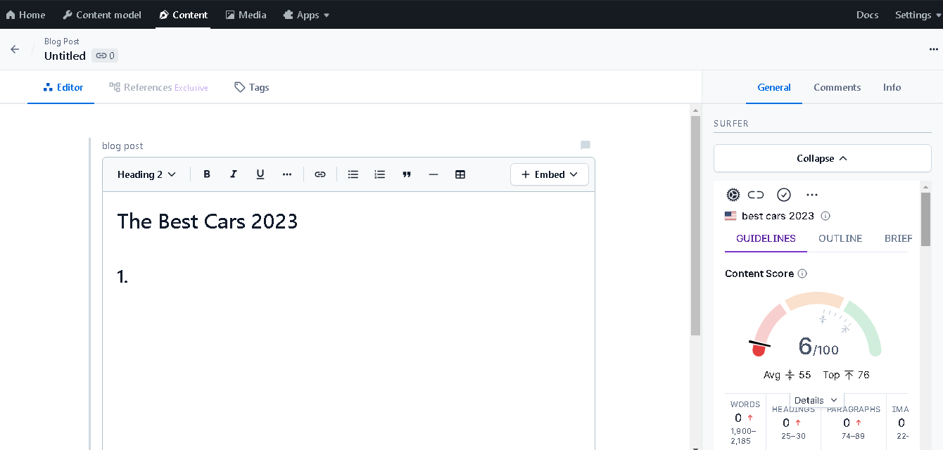 β οΈ The integration allows you to link existing Surfer guidelines or create new ones directly in Contentful, but thereβs no sync for content. You will need to copy-paste the content manually from one Editor to another.