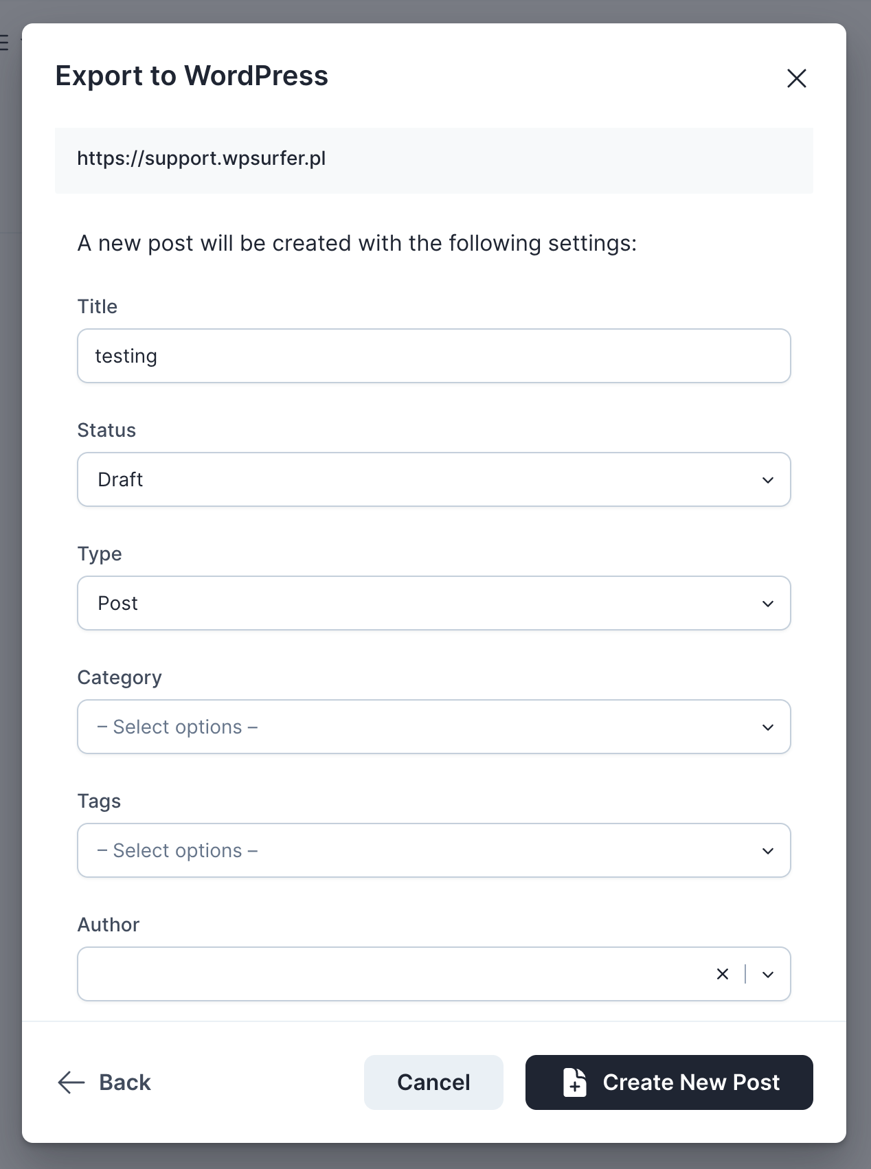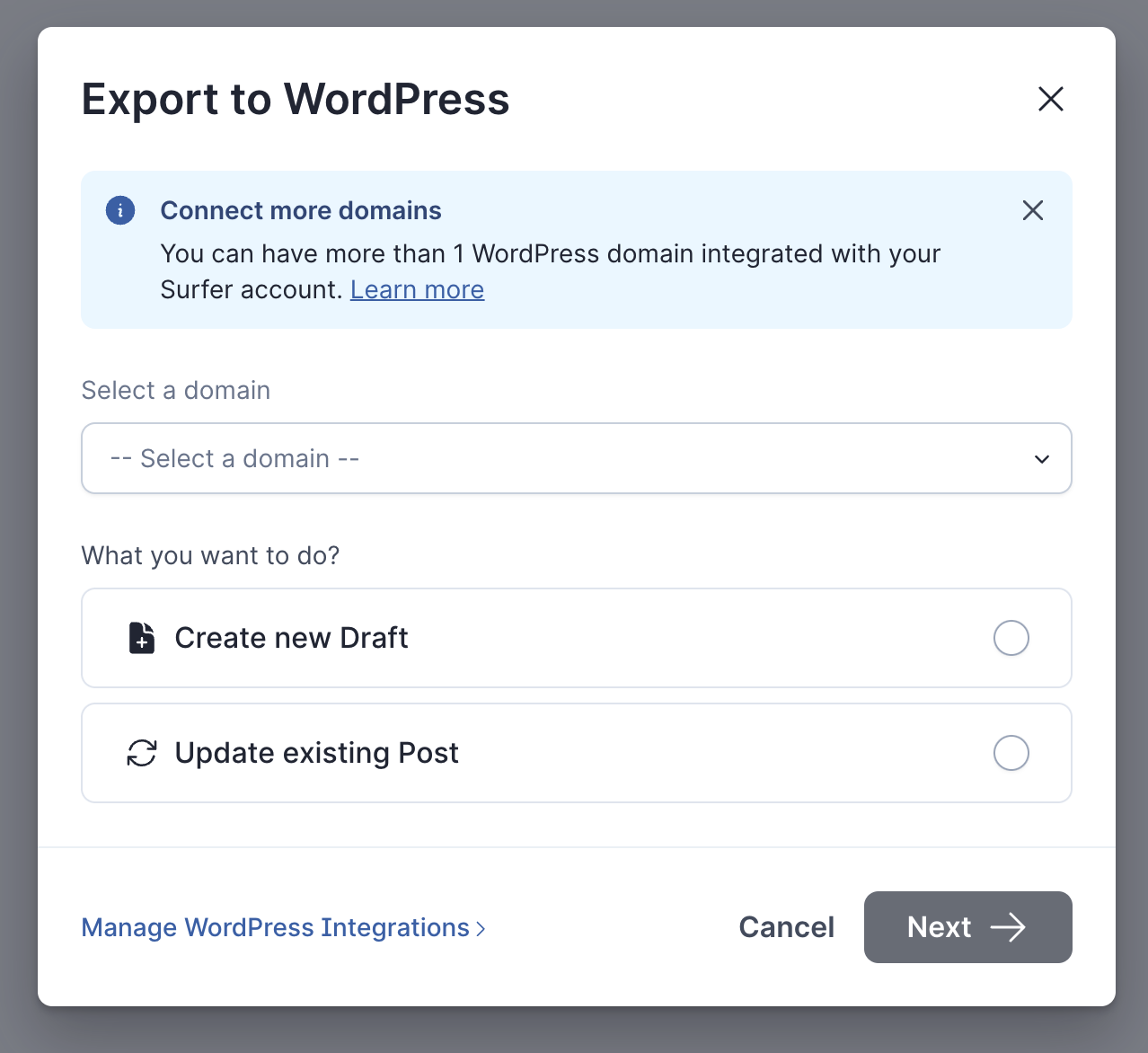 2. Choose if you want to create a new WordPress draft or update an existing WordPress post or page. If you have more than one domain connected, you need to select one for the export.