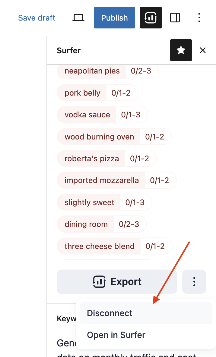 Just go to the WordPress post or page, open the Surfer tab, scroll down, and at the end of the terms list, click three dots, then "Disconnect."