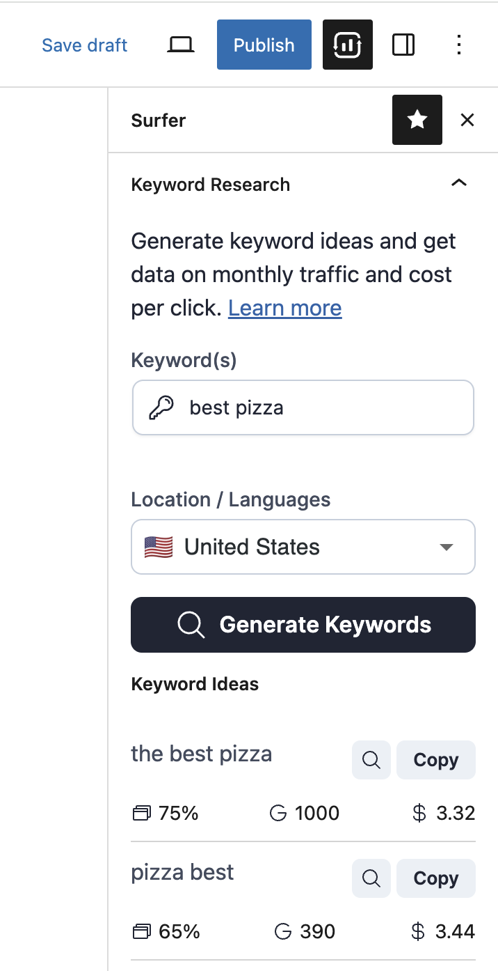 The Keyword Research module in the WordPress plugin allows you to get keyword suggestions. All you need to do is put a keyword for which you want to find similar keywords, the location that you want to rank for, and click on the purple "Generate Keyword Ideas" button.