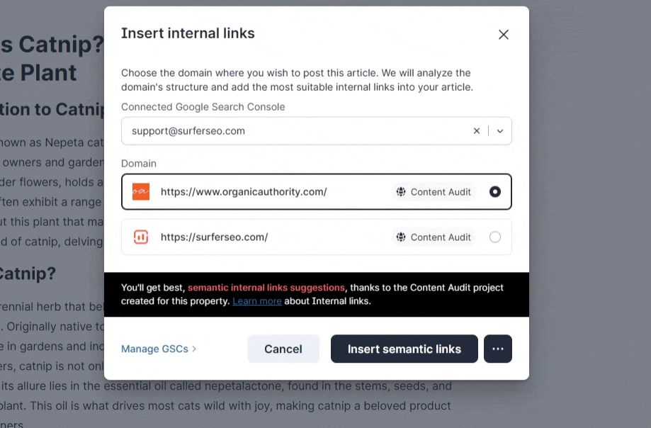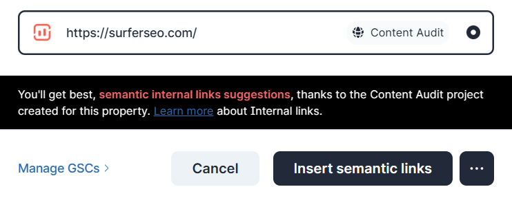 Semantic Internal LinkingThis is Surfer’s most advanced internal linking method — now available to 100% of users. Semantic Internal Linking is available as an option only if: