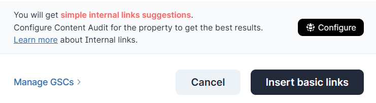 Basic Internal LinkingThis option allows you to insert internal links without a Content Audit project, but you still need the Google Search Console connection.