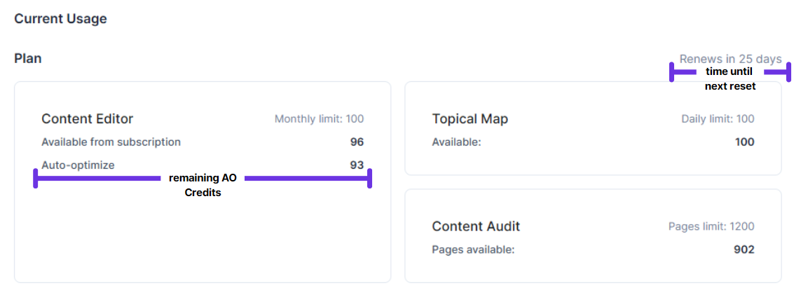 Legacy users: The credits will depend on your Legacy plan. However, you can always head to the Current Usage page or hover over the Auto-Optimize button in your Content Editor to see how many you have left. If you have questions about your credits, please contact us at [email protected].