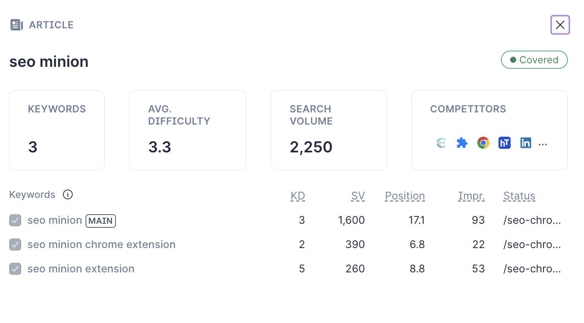 Competitors: By clicking the icons, you can consult the competitor's article ranking for the keywords in the cluster.