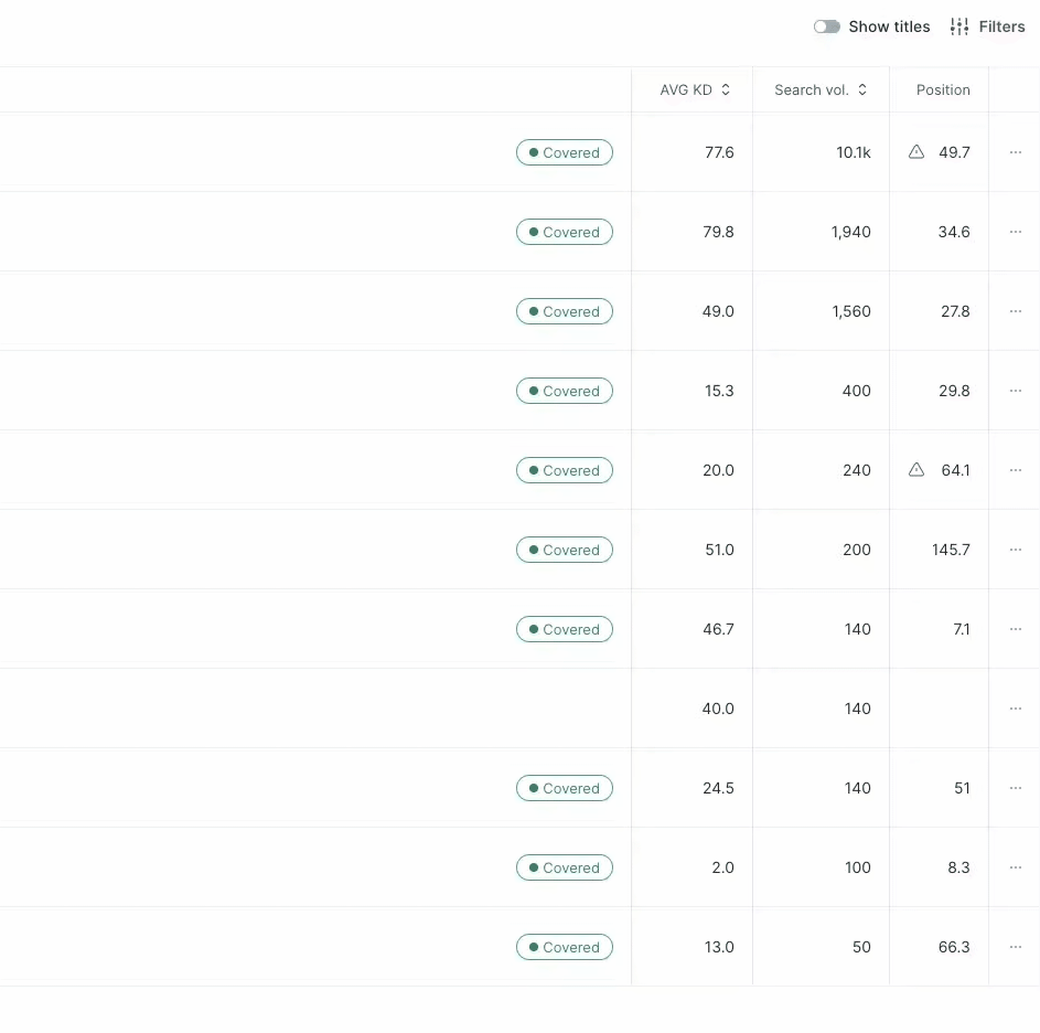 New articles: Those are the articles and clusters you have yet to cover. So, spotting the full list of articles you should work on next is easier. Because these articles are not covered yet, instead of seeing the positions, you get Topics.