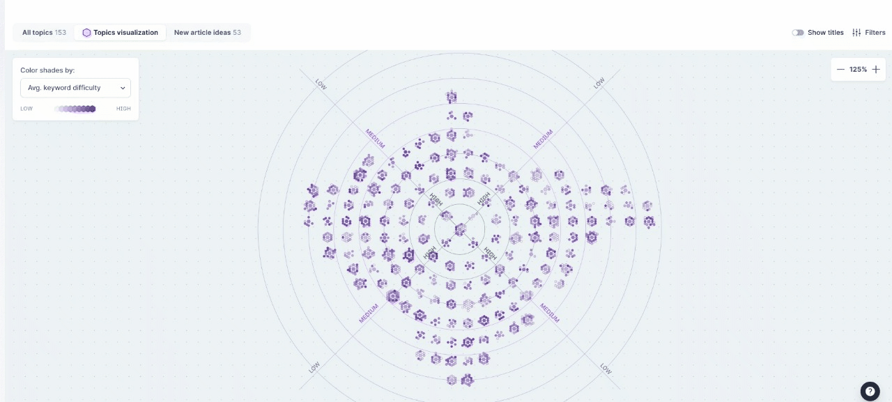 In a nutshell, Topical Map identifies new opportunities for your content by analyzing your topical coverage and finding “neighbor” topic clusters based on semantic similarity.