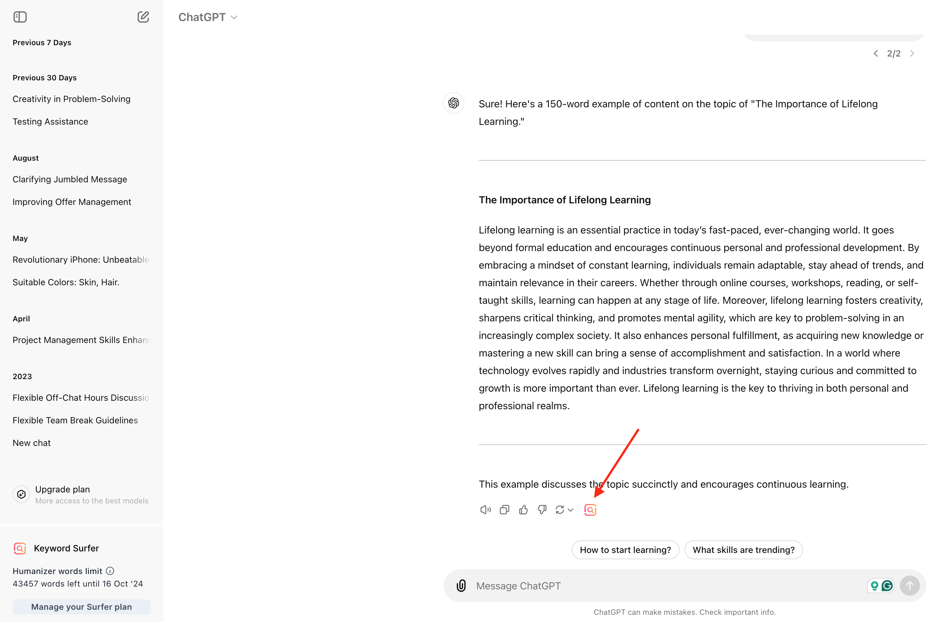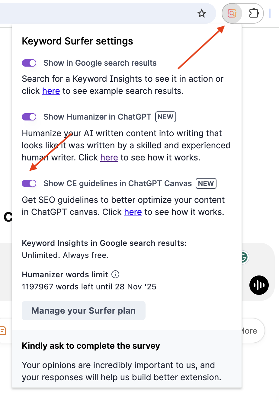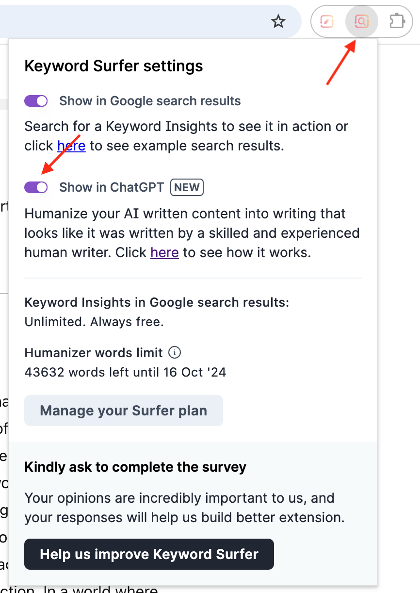 Keyword Surfer now allows you to use Surfer's Humanizer to make ChatGPT more human-like! You can also provide ChatGPT with Surfer content recommendations so they are added to your ChatGPT-generated content with a simple one prompt!