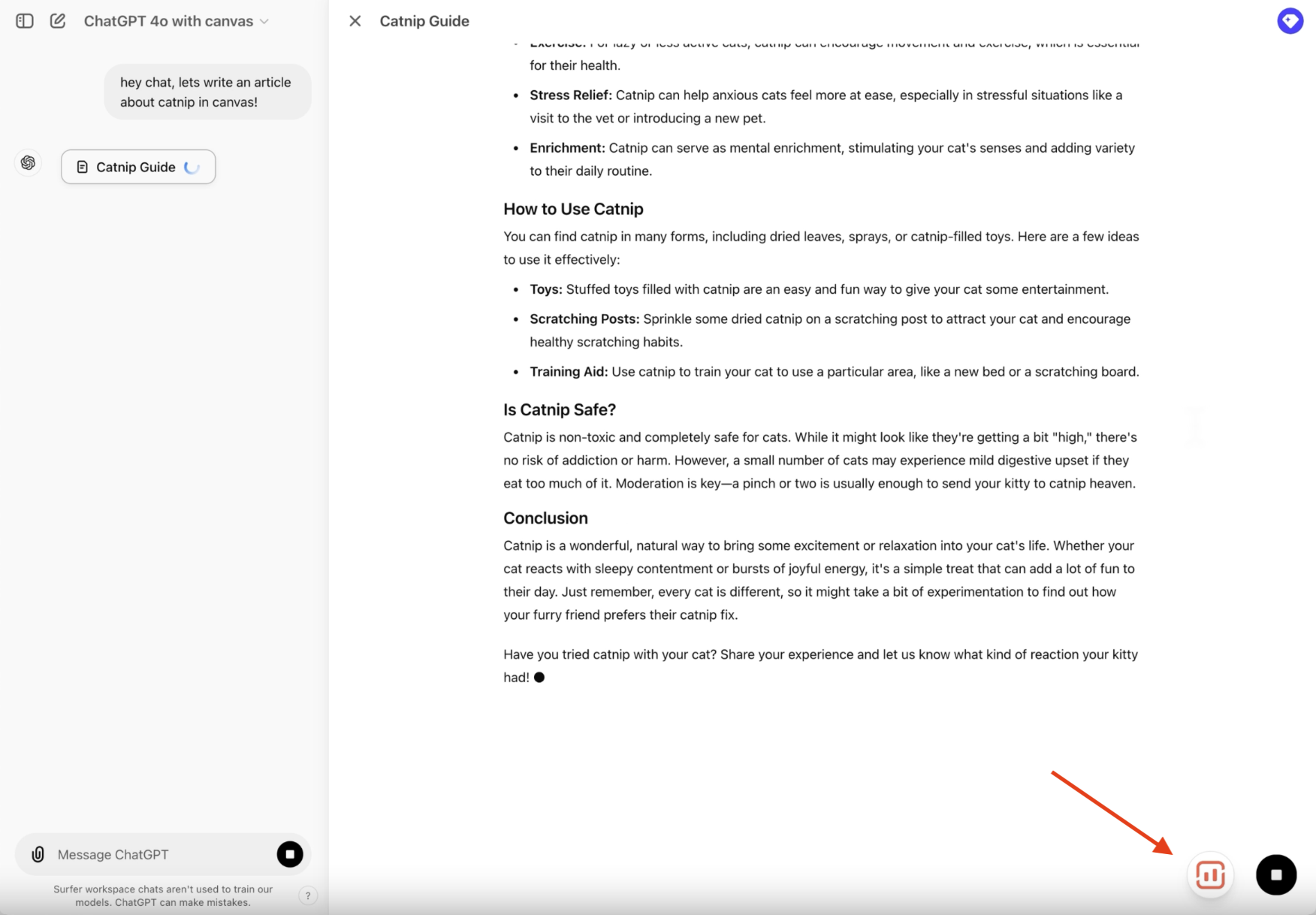 When the Canvas model is already on, send a first prompt, then click on the Surfer logo in the bottom-right corner to turn on the Surfer Content Editor Guidelines panel: