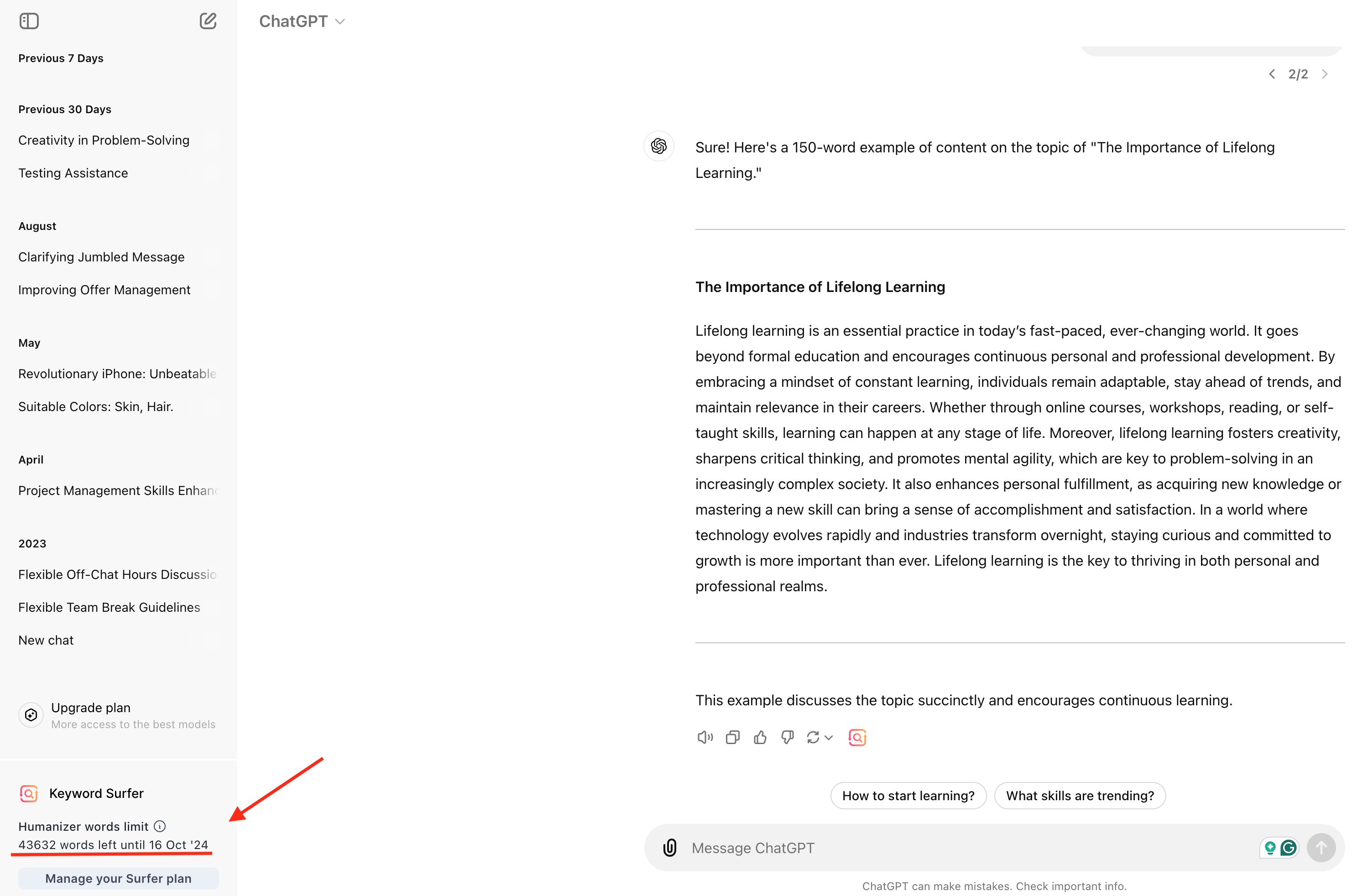 Next, open ChatGPT, and in the left-bottom corner, you will see your Humanizer words limit. Please ensure that you are logged in to your Surfer account (if you already have one) to have the paid Humanizer limit reflected