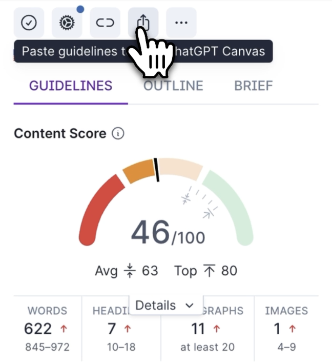 Find the "Pass guidelines to your ChatGPT Canvas" button at the top of the Surfer panel. Write your instructions for ChatGPT to include those keywords in your content: