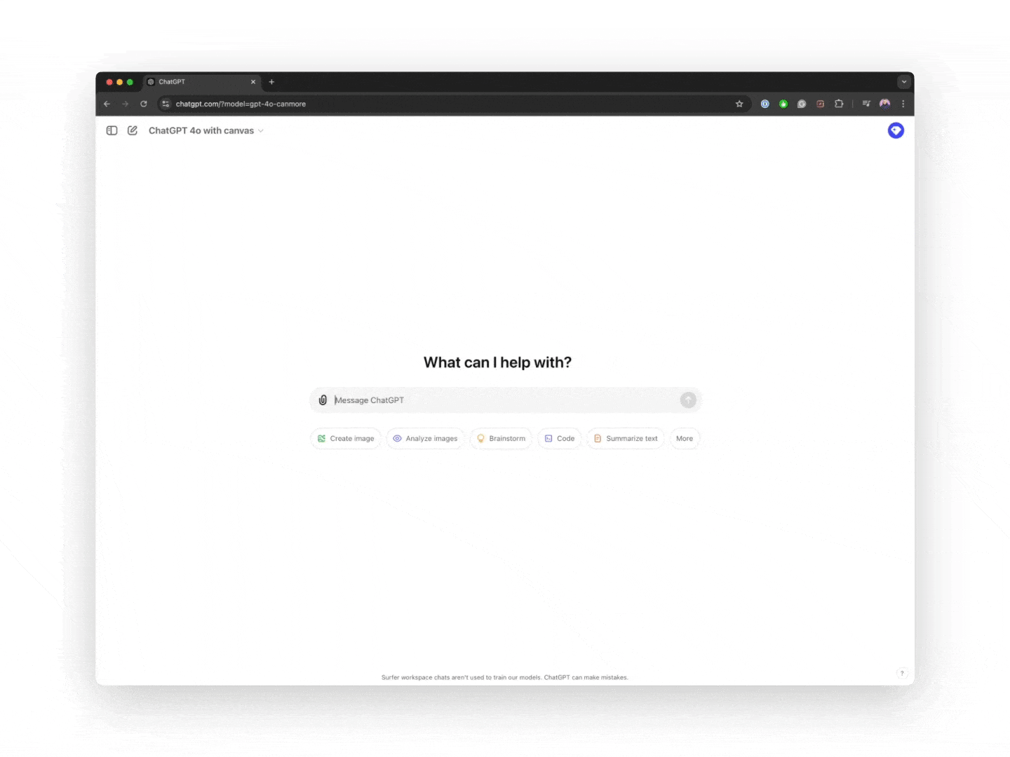 The Keyword Surfer extension only works with the ChatGPT Canvas model. Clicking the Surfer icon prematurely will show "Surfer Loaded," but nothing will appear until you open the Canvas.